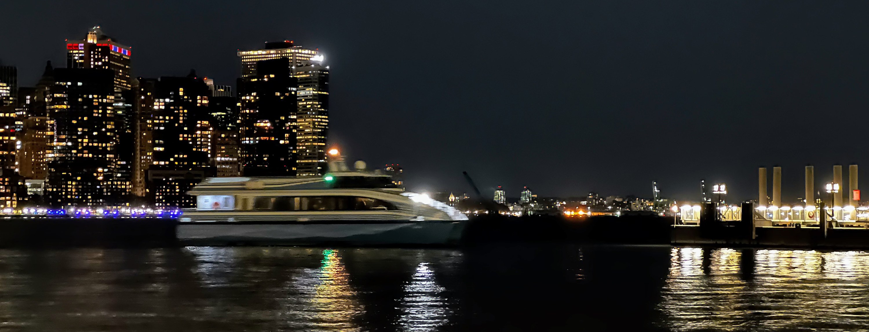 A river taxi glides past the Jersey bank, its reflection stretching like a thought across the Hudson. The water is no longer grey - it’s ink. This frame is made of movement and waiting. The boat sails quickly, but the buildings behind it remain, like time itself. The scene becomes an allegory: progress moving forward while history holds the shore.